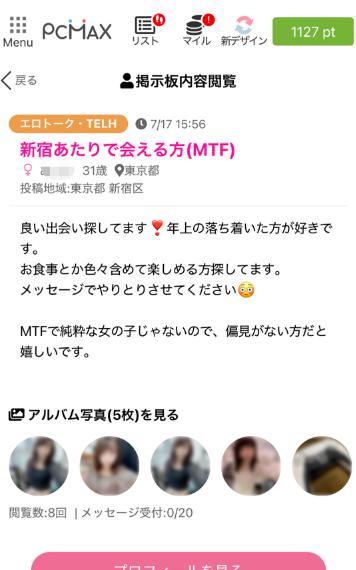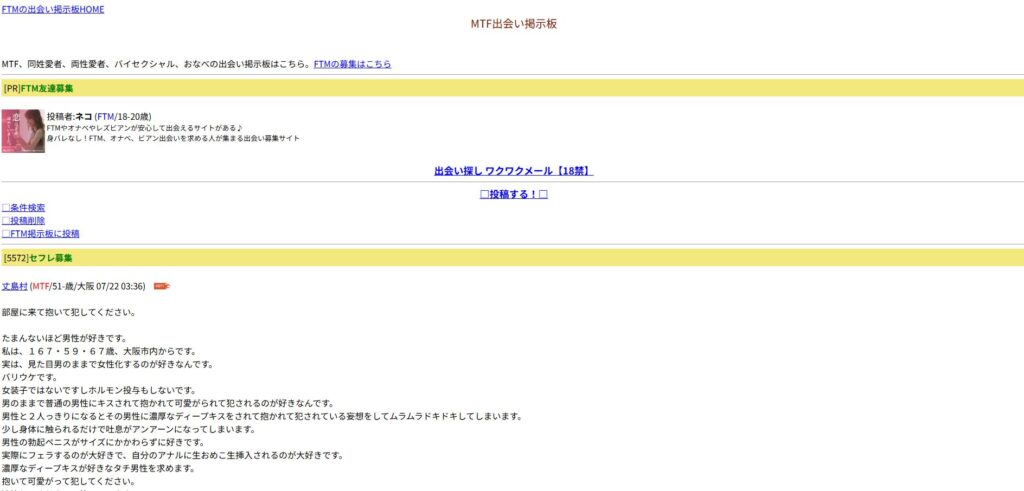 出会い系アプリの「掲示板機能」は比較的安全性が高く、MTFトランスジェンダーの出会いも期待できるからです。