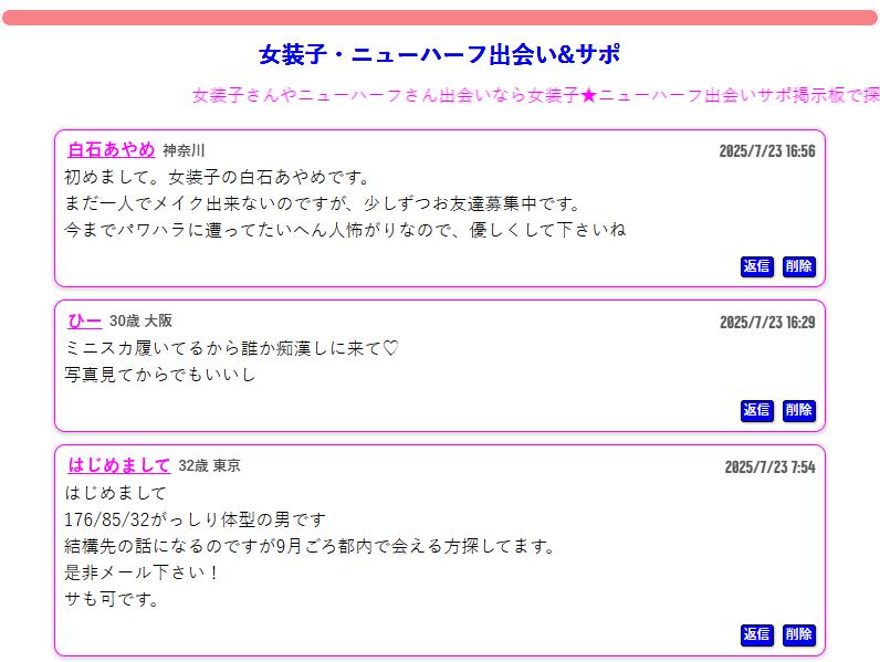これらの掲示板で「男の娘」や「女装子」と出会うことはできません。