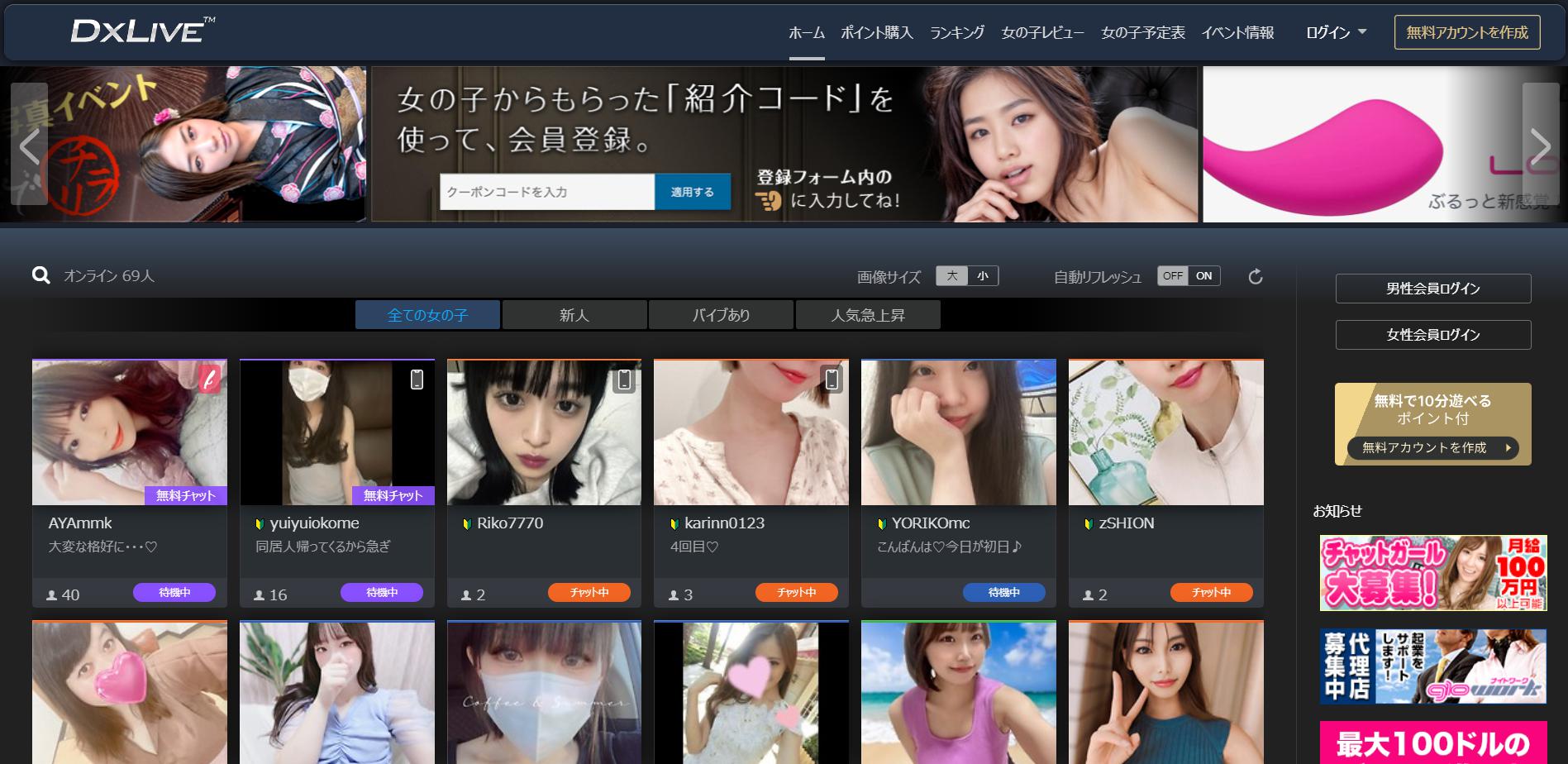 無修正ライブチャットは基本的に海外サービス限定ですが、DXLIVEは操作感も機能も国内サイトとほぼ同じ。