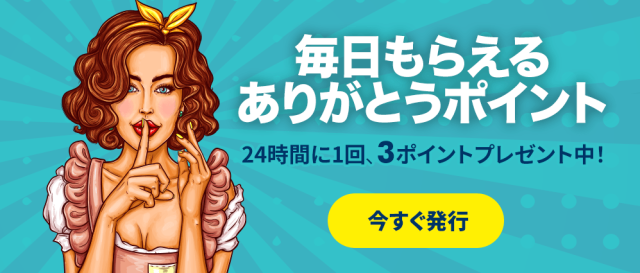 有料ポイントを購入し、過去2週間以内に0.6ポイント以上チャットで使った人限定で、毎日「ありがとうポイント」がもらえます。