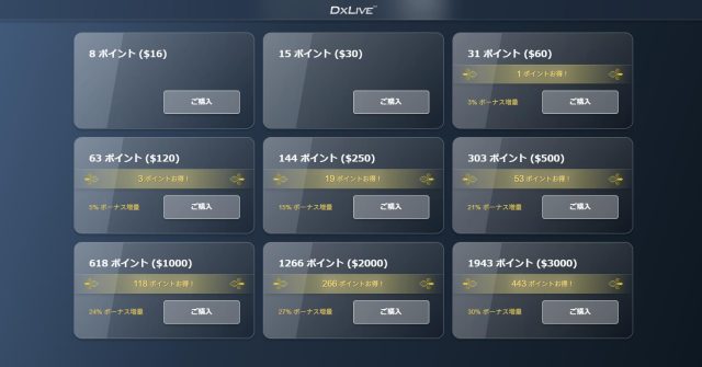DXLIVEの会員登録は無料ですが、実際にチャットを楽しむにはポイント購入が必要になります。
